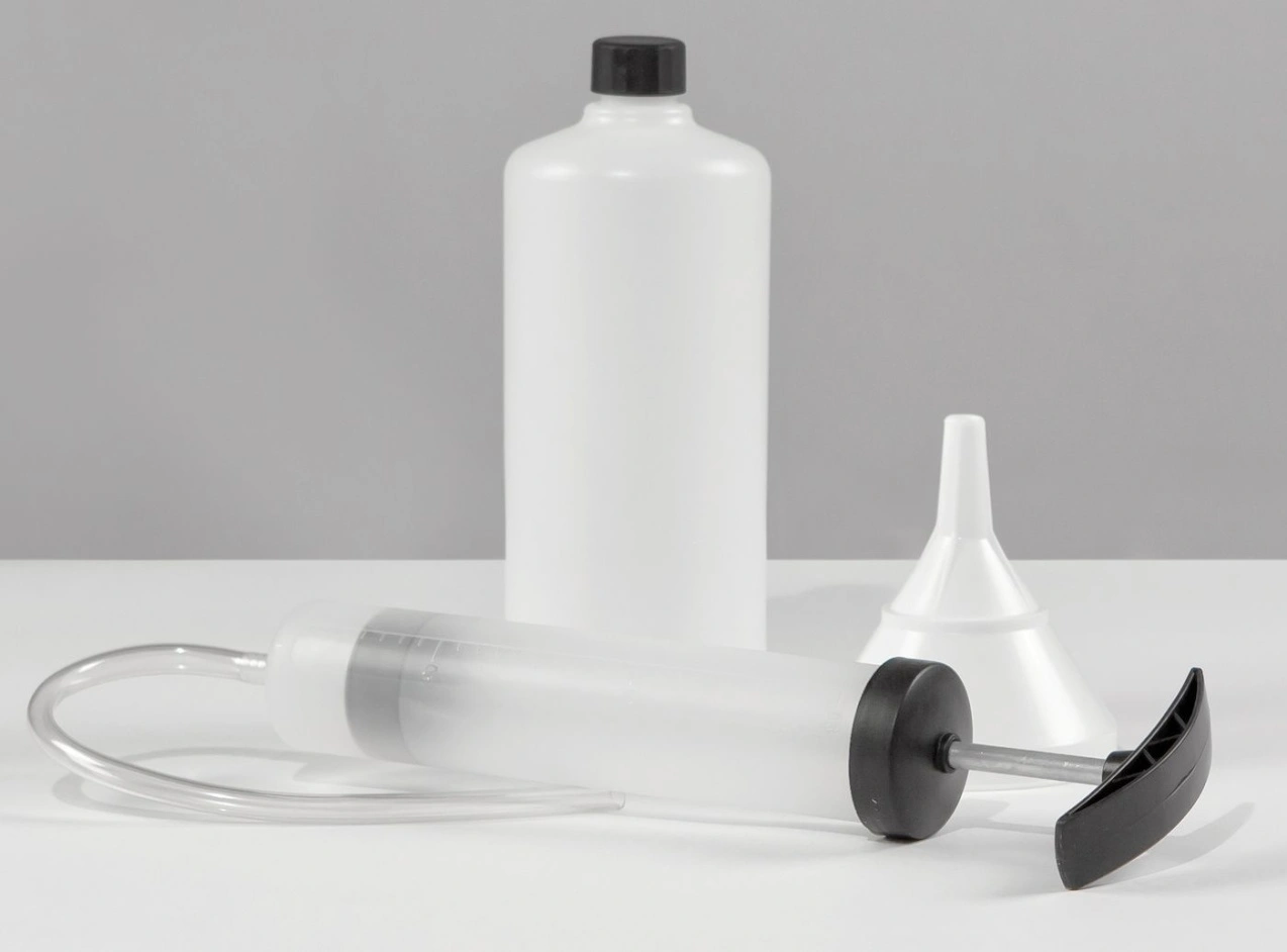 Sisältää: täyttöpullo, suppilo ja imupumppu
