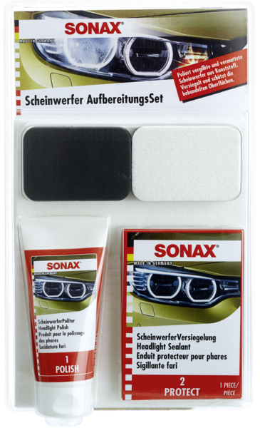 Ajovaloumpioiden kirkastussarja. Mattaantuneiden ja kellastuneiden umpioiden hiontaan ja puhdistukseen. Kirkastaa umpiot parantaen näkyvyyttä.Pakkaus sisältää: 75 ml SONAX Headlight Polish Hionta-aine, 2 SONAX Headlight Sealant Cloths Pinnoiteliinaa, 2 Kiillotussientä, 4 Vesihiomaruusuketta P5000, 4 Kiillotusliinaa.