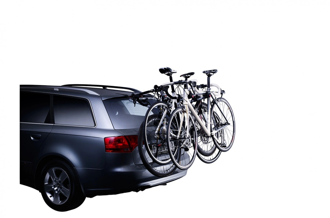 Erityisesti farmariautoihin tarkoitettu takaoveen kiinnitettävä turvallinen polkupyöräteline, jolla voi kuljettaa kolmea pyörää