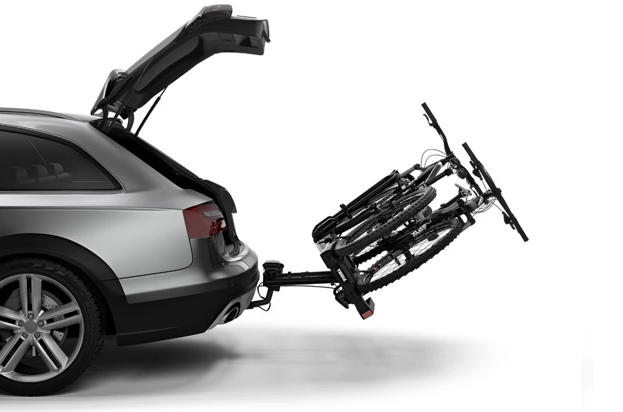 Taittuu kätevästi kokonaan asennuksen, käsittelyn ja säilytyksen helpottamiseksi. Hyvän kantavuuden ansiosta teline soveltuu sähköpyörien ja raskaiden maastopyörien kuljettamiseen. Pyörät on helppo kiinnittää irrotettavien pidikkeiden avulla. Ne on varustettu lukittavilla Thule AcuTight -kiristyksen rajoitusnupeilla, joista kuuluu naksahdus, kun kiristys on optimaalinen. Renkaanpitimien suuri väli mahdollistaa tanakoiden, akseliväliltään suurten polkupyörien kuljettamisen. Säädettävien pumppusolkien ja erikoispitkien rengashihnojen ansiosta renkaiden kiinnitys on helppoa, ja telineessä voi kuljettaa myös fatbike-pyöriä (enintään 4.7 tuuman renkaat). Näppärän poljinkäyttöisen kallistustoiminnon ansiosta tavaratilaan pääsee käsiksi myös silloin, kun telineessä on polkupyöriä. Polkupyöräteline on helppo kiinnittää ja säätää ennen kiristyskahvan sulkemista vetokoukkuliittimen alkuvakauden ansiosta. Integroitujen pyörien ja kantokahvan ansiosta polkupyörätelineen kuljettaminen on ergonomista. Esiasennettu, työkaluja ei tarvita. Lukitsee polkupyörät polkupyörätelineeseen ja teline vetokoukkuun (lukot mukana). Lisävarusteena telineeseen on saatavilla lastausramppi ja säilytyspussi.