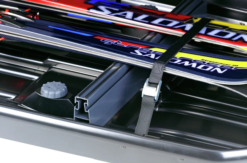 Suksien turvalliseen ja suojattuun kuljetukseen kuljetuslaatikon sisässä.